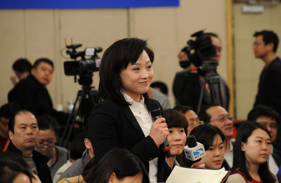 3月6日,十二屆全國人大一次會議新聞中心在梅地亞舉行記者會,國家發展和改革委員會主任張平就“經濟社會發展與宏觀調控”的相關問題回答中外記者的提問。圖為湖北衛視記者提問。新華網/中國政府網 翟子赫 攝