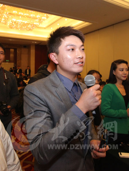 大眾網特派記者就大眾網網友提出的問題現場向十二屆全國人大代表、煙臺市委副書記、市長王良提問。(大眾網特派記者 赫洋 攝)