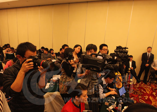 十二屆全國人大一次會議山東代表團開放日吸引了眾多媒體記者。(大眾網特派記者赫洋 攝)