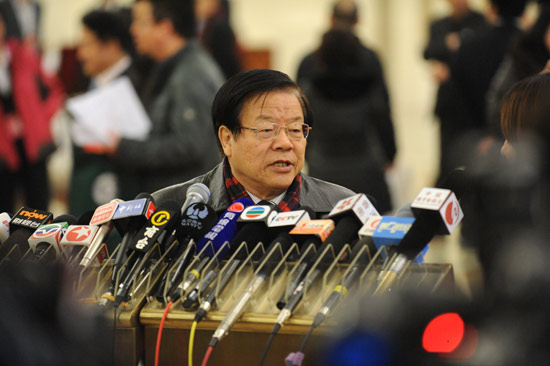 3月10日,第十二屆全國人民代表大會第一次會議舉行第三次全體會議,聽取最高人民法院院長王勝俊作最高人民法院工作報告;聽取最高人民檢察院檢察長曹建明作最高人民檢察院工作報告;聽取國務委員兼國務院秘書長馬凱關于國務院機構改革和職能轉變方案的說明;表決第十二屆全國人民代表大會第一次會議選舉和決定任命的辦法草案。圖為文化部部長蔡武接受記者群訪。 新華網/中國政府網 陳競超 攝