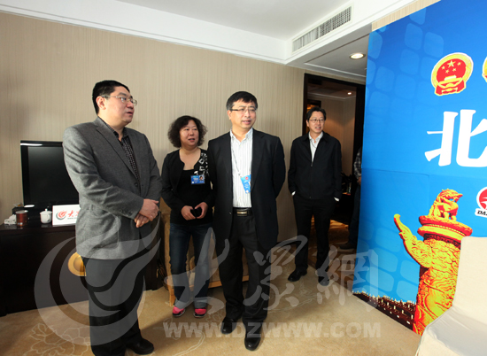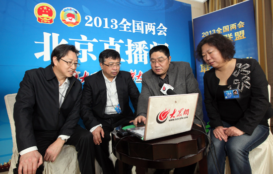 3月6日上午,省委宣傳部副部長李建軍(左三)視察大眾網2013全國兩會北京直播間。(特派記者 盛堃 攝)