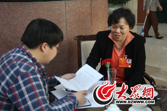 十二屆全國人大代表、山東省梁山縣土囤村黨支部書記胡桂花向大眾網記者介紹她關于提升農村教師待遇的建議 。(大眾網特派記者 盛堃 攝)