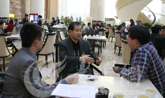 十二屆全國人大代表、滕州市大宗村黨總支書記宗成樂(中)接受大眾網記者專訪 。(大眾網特派記者 張帆 攝)