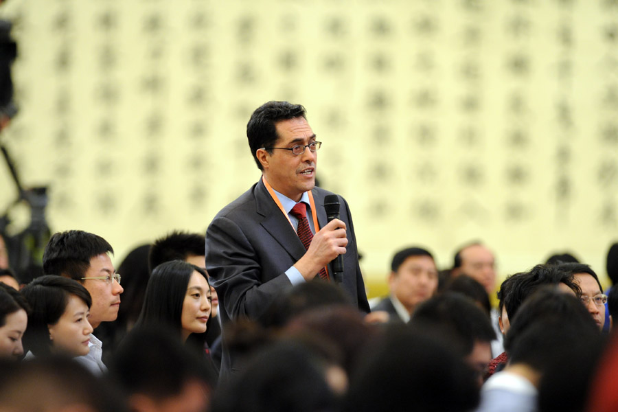 3月9日,卡塔爾半島電視臺記者提問。當日,十二屆全國人大一次會議舉行記者會,外交部部長楊潔篪就“中國的外交政策和對外關系”答中外記者問。新華網/中國政府網 陳競超 攝