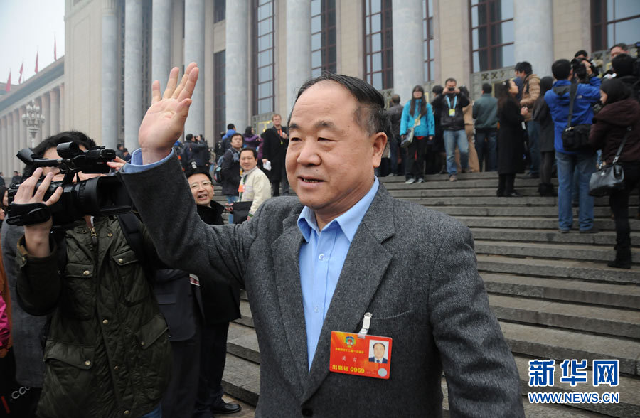 3月12日, 全國政協十二屆一次會議在人民大會堂舉行閉幕會。圖為大會結束后,全國政協委員莫言離開會場時向記者揮手告別。新華網 翟子赫 攝