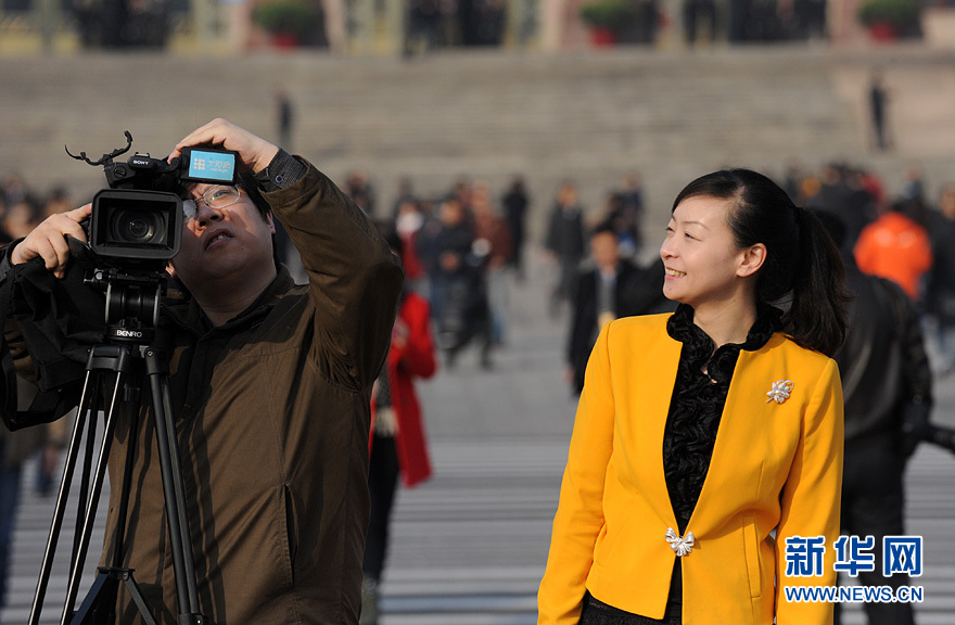 3月5日上午9時,第十二屆全國人民代表大會第一次會議在人民大會堂開幕。媒體女記者、會議禮賓服務人員的笑容在天安門廣場上美麗綻放。新華網 陳競超 攝