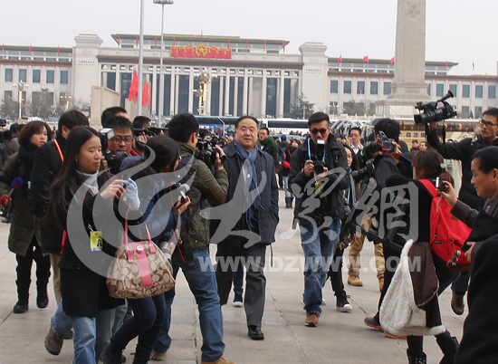 今天下午,在人民大會堂,全國政協十二屆一次會議召開預備會。在入場時,全國政協委員趙本山、陳凱歌和毛新宇等明星委員成為眾媒體記者采訪的焦點,他們被“圍追堵截”幾乎寸步難行。
