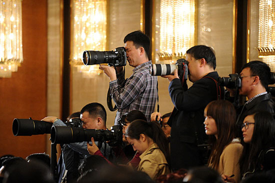 3月4日,十二屆全國人大一次會議在人民大會堂一層新聞發布廳舉行新聞發布會,由大會發言人就會議議程和人大工作相關的問題回答中外記者的提問。這場發布會吸引眾多媒體前來報道。新華網/中國政府網 陳競超 攝