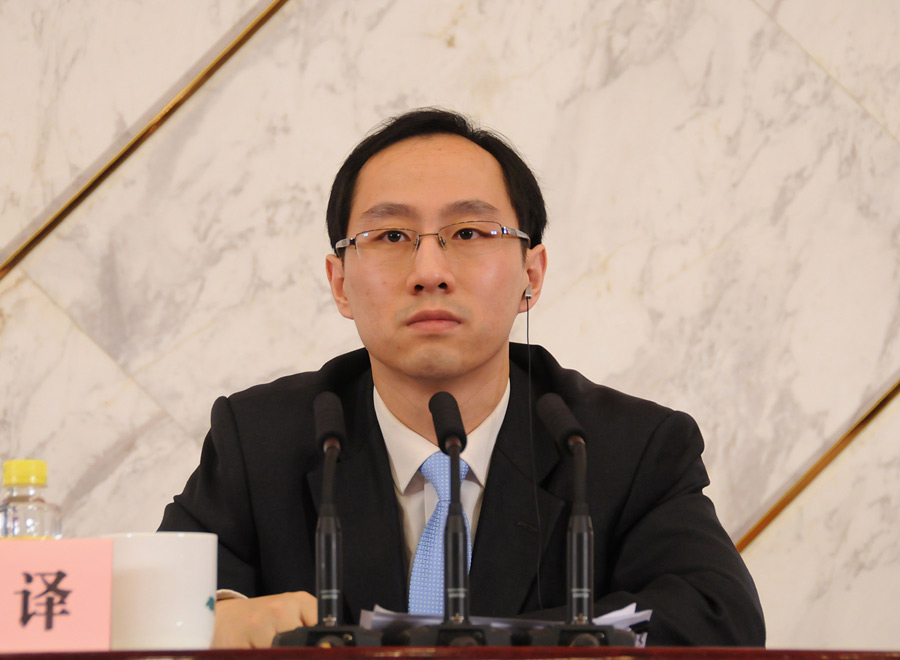 3月4日,十二屆全國人大一次會議在人民大會堂一層新聞發布廳舉行新聞發布會,由大會發言人就會議議程和人大工作相關的問題回答中外記者的提問。圖為發布會現場翻譯。新華網/中國政府網 翟子赫 攝
