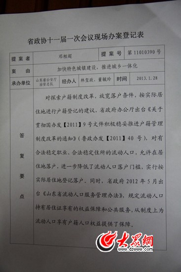 大眾網濟南1月28日訊(記者 王磊 張帆)在省政協十一屆一次會議上,十一屆省政協委員鄧相超向大會提交了《加快特色城鎮建設,推進城鄉一體化》的建議,經立案辦理后,今天下午,省公安廳治安總隊有關負責人當面回復稱,目前我省對于有合法穩定職業、合法穩定住所的流動人口,允許在居住地落戶。