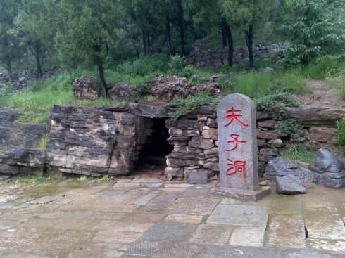 據說孔子的母親顏征在懷孕后,多次與丈夫叔梁紇到尼山祈禱,求山神保佑生個理想的兒子。最末一次祈禱后行至山麓之時,即刻大霧迷蒙,凝霧為雨,瞬間雨止,眼前竟隱約出現一座金碧輝煌的殿堂。顏征在頓覺腹痛,叔梁紇忙將她扶入殿堂。不多時,孔子便在仙樂聲中降生。立時霧散景移,眼前仍然是一片荒野。顏征在從昏迷中醒來,見生一個男孩,喜出望外;但仔細一打量,卻見孩子頭頂似反盂,中低四旁高,且眼露筋,鼻露孔,耳露輪,嘴露齒等,故稱“七露”。叔梁紇以為生了個怪物,便把孩子棄于野嶺,扶著顏征返回家中。此時正值炎夏,孩子躺在草地上熱得直喘粗氣。天空盤旋的老鷹看見了,忙用翅膀給孩子扇風。黃昏時,從山上走來一只老虎,把孩子銜進山洞(即今夫子洞,又名坤靈洞),為他哺乳。第二天一早,一位老者上山打柴。老虎看見老者后,上前叼住他的衣服,這可把老者嚇壞了,以為老虎這回肯定要把他吃掉了,連忙向老虎作揖,肯求老虎放過自己。老虎叼著老者的衣服往山洞這邊走,沒有絲毫傷害他的意思。來到山洞,老者看到一個孩子,就明白了老虎的意思,于是,連忙抱起孩子往山下走去。下山的時候,老者看到,老虎還向自己點頭致謝呢。故人稱孔子降生是“龍生虎養鷹打扇”,帶有濃郁的神話色彩。