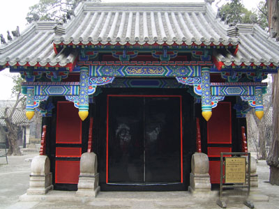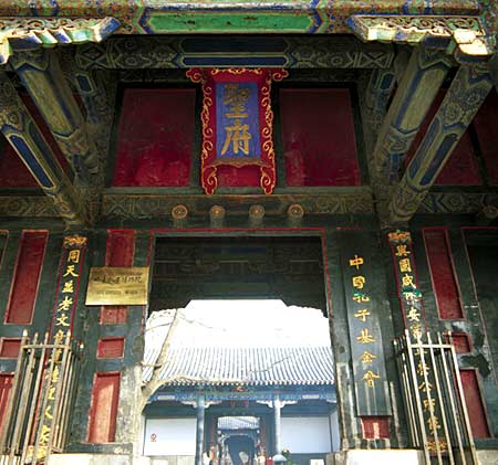 穿過第一進狹長的庭院,便是孔府中路的第二道大門,俗稱二門。門建于明代,門楣高懸明代詩 人、吏部尚書、文淵閣大學士李東陽手書“圣人之門”豎匾,下有閥閱承托,門柱有石鼓夾抱。正門左右各有腋門一座,耳房一間。在封建社會,平時只走腋門,正門不開,以示莊嚴。