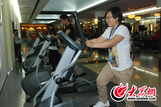 在體育公園全民健身活動中心內,采訪團記者體驗健身運動器材。記者 郭豪 攝