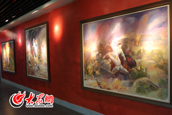 展廳的墻壁上懸掛著多幅抗戰(zhàn)題材油畫。