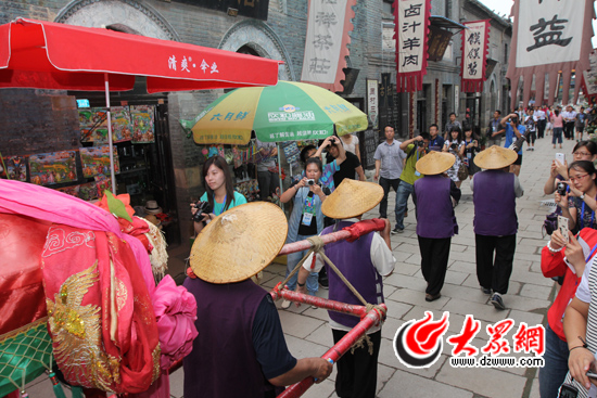 周村大街上民俗婚禮表演的娶親隊伍經過記者們身旁。