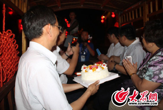 大眾網棗莊6月21日訊(記者 郭豪 赫洋 呂斌)“Happy birthday to you,Happy birthday to you……”今天晚上,“聚焦美麗山東—中國網絡媒體山東行”西線采訪團在臺兒莊古城登船夜游采訪,6位在本月生日的采訪團成員驚喜地獲得了會務組精心準備的奶油蛋糕,在游船上在夜色里,大家共同度過一個歡樂、愜意的夜晚。