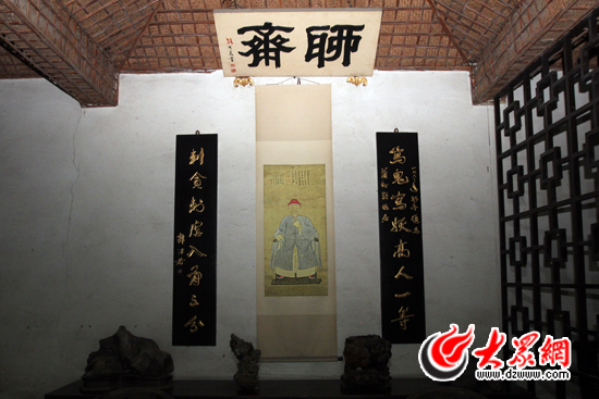 22日上午,記者一行人走進(jìn)這座具有典型北方農(nóng)家院落風(fēng)格的故居,一進(jìn)正門(mén),三棵古槐盤(pán)根錯(cuò)節(jié)聳立路邊,好像在訴說(shuō)著蒲松齡的蒼桑,也記載著蒲家莊的變遷。門(mén)楣上懸掛著郭沫若題寫(xiě)的匾額:“蒲松齡故居”。院內(nèi)有瓦舍茅屋,花叢瓜架,既有書(shū)屋情趣,又還有農(nóng)舍野味。書(shū)房“聊齋”內(nèi),高懸著蒲松齡研究專家路大荒手書(shū)的“聊齋”匾額,匾下是蒲松齡74歲時(shí)身著公服、手捻銀須的畫(huà)像。