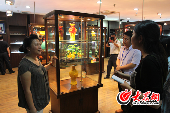 淄博陶琉名人藝術(shù)館經(jīng)理劉建向記者介紹琉璃制作技藝的發(fā)展史。大眾網(wǎng)記者 馬鑫 攝