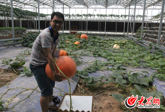 生態園里最引人注意的就是“巨型南瓜”了,普通的巨型南瓜重達100多斤,大個的能達到200多斤。一名記者試圖將大個南瓜抱起來,其他記者紛紛拍攝。 (記者 郭豪 攝)