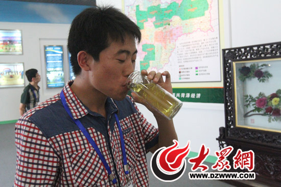 中華泰山網的記者王磊品嘗牡丹茶后,連說“好喝”。 記者 郭豪 攝