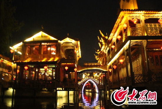 白天的臺兒莊古城清美寧靜,青石板路,亭臺樓閣,清水在路邊盈盈流淌,游人在這里放下心事盡情賞景。古城似有南方小鎮(zhèn)的婉轉(zhuǎn)清秀,又流露出北方水土的豪邁風(fēng)情。采訪團(tuán)的記者們來到此地后倍感驚訝:“北方竟也有這般富含風(fēng)韻的古城?”