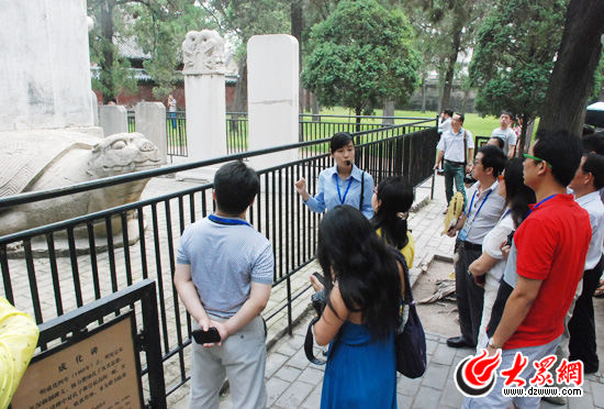 今天上午,天氣雖然比較炎熱,但一點也擋不住記者們的參觀和采訪熱情。在萬仞宮墻、金聲玉振牌樓前,大家一邊認真聽講解一邊隨手用筆記錄,隨后再用相機、攝像機記錄下所見所聞。