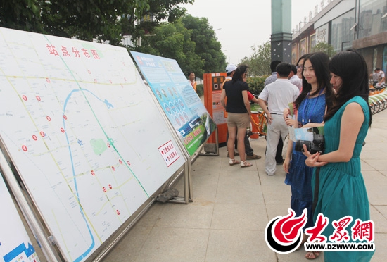 兩位記者觀看公共自行車分布點(diǎn)地圖。 記者 郭豪 攝