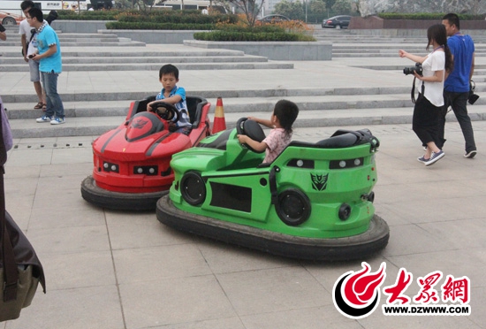 兩名孩子在悉仲廣場內(nèi)玩碰碰車,奚仲廣場是薛城區(qū)的居民休閑娛樂的好去處。 記者 郭豪 攝