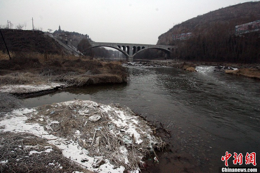 12月31日,位于山西長治境內的化工廠發生苯胺泄漏事件。5天之后,山西省政府及河北河南政府接到事故報告時,泄漏苯胺已隨河水流出山西。事故發生后,當地政府在排污渠和濁漳河的交匯處,堆積了幾十個裝滿活性炭的大袋子,當地村民未接到任何通知。圖為排污渠與濁漳河交匯口河邊隨處可見除污所用的石灰。