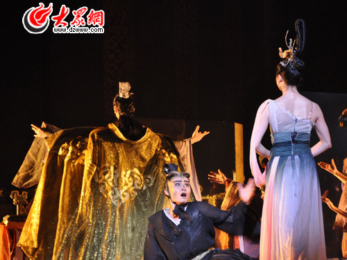上半場(chǎng),在曹植第一次見(jiàn)到甄氏時(shí),圓月格外皎潔,甄氏撥動(dòng)的琴弦鳴響在曹植的心中,使人們忽然產(chǎn)生了飄離呻吟與哭叫的戰(zhàn)火,升騰到和平生活本該有的那種夢(mèng)境的感覺(jué),高潔,清雅,伴隨著矛盾升級(jí),音樂(lè)的舒緩變?yōu)榧睖悾晞?shì)浩大的傳統(tǒng)鼓舞搬上了舞臺(tái),曹丕和曹植在鼓樂(lè)下激烈對(duì)舞,高潮迭起,讓人為他們捏了一把汗。