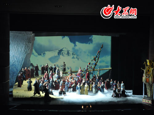 隨著恢宏空曠的交響樂聲響起,幕布慢慢拉起,一幅萬里白云、一望無垠的西藏場景如真似幻的展現在了觀眾的眼前,由當代最負盛名的男高音歌唱家魏松扮演的格桑率先出場,粗狂豪邁的嗓音一亮,便贏得了現場觀眾的陣陣掌聲。