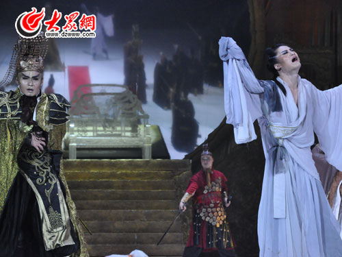 上半場,在曹植第一次見到甄氏時,圓月格外皎潔,甄氏撥動的琴弦鳴響在曹植的心中,使人們忽然產生了飄離呻吟與哭叫的戰火,升騰到和平生活本該有的那種夢境的感覺,高潔,清雅,伴隨著矛盾升級,音樂的舒緩變為急湊,聲勢浩大的傳統鼓舞搬上了舞臺,曹丕和曹植在鼓樂下激烈對舞,高潮迭起,讓人為他們捏了一把汗。