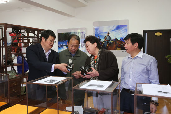 圖一為山東省貿(mào)促會黨組書記馬嘯、山東藝術(shù)學(xué)院副院長劉曉靜、山東省文化產(chǎn)業(yè)國際商會副會長由維禮等在檢查即將展出的展品。