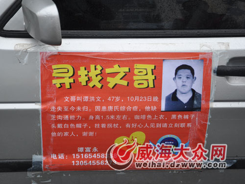 威海市民周偉和看到車隊車身上張貼著“尋找文哥”的啟示之后,主動走上前給譚春玲出主意,“找媒體幫忙報道一下,讓大家都知道,也好找。”他還告訴記者:“這是個好人啊,我要是在路上見著了,一定會打110,幫著他早點回家。”
