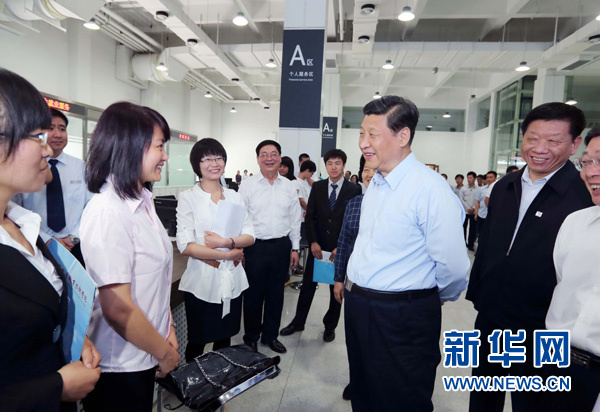 5月14日至15日,中共中央總書記、國家主席、中央軍委主席習近平在天津考察工作。這是習近平在天津人力資源發展促進中心與應聘人員親切交談。
