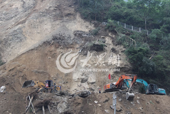 寶興縣城連通五個鄉鎮的兩河口路被塌方泥土和巨石阻斷,救援人員正在緊急作業,排除障礙。特派記者 尹海洋 攝