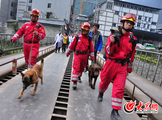 22日下午,大眾網特派記者反復輾轉,終于深入到雅安地震震中區——寶興縣。一度成為“孤島”的寶興縣,今天下午道路終于被救援隊員搶通了。記者在寶興縣看到,國家救援隊派出4條警犬用于搜救,爭分奪秒地抓住黃金救援時間。
