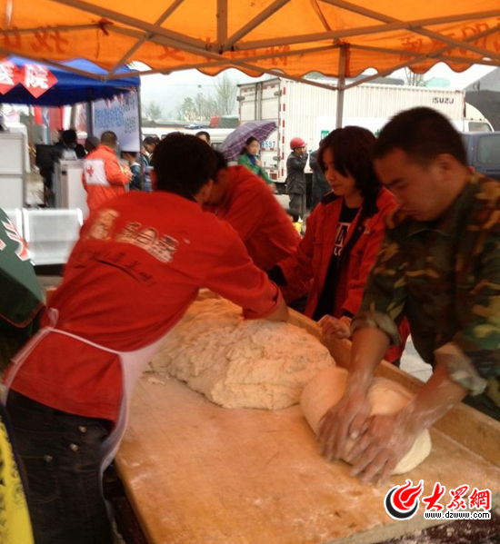 23日早,蘆山縣城區(qū)及周邊震區(qū)群眾冒雨在街頭領(lǐng)饅頭。特派記者 李兆輝 攝