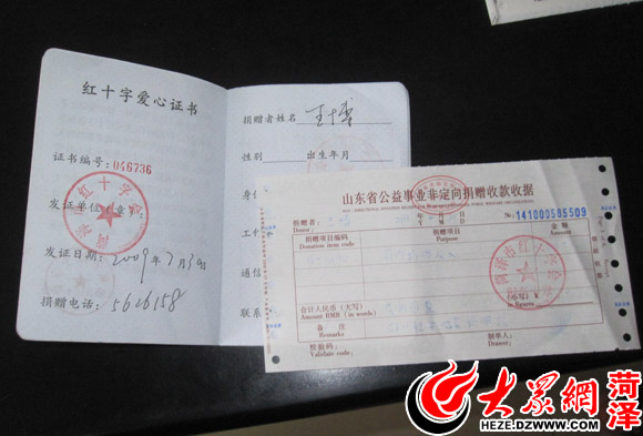大眾網(wǎng)記者在王博的紅十字愛心證書上看到,從2009年7月30日開始,王博已經(jīng)在菏澤市紅十字會(huì)捐款5次,共捐善款1000元。