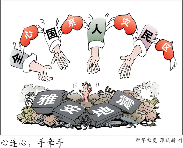 我們已經(jīng)看到:支持,第一時間向雅安奔去;愛,第一時間向雅安匯聚。各級政府啟動應(yīng)急預(yù)案,救援人員迅速出動,醫(yī)務(wù)人員攜帶藥品趕赴現(xiàn)場,帳篷、食品等救災(zāi)物資源源不斷運(yùn)往前方。更多普通人以捐款、捐贈、倡議等各種方式助力災(zāi)區(qū),這都是愛的傳遞,都是愛的接力。