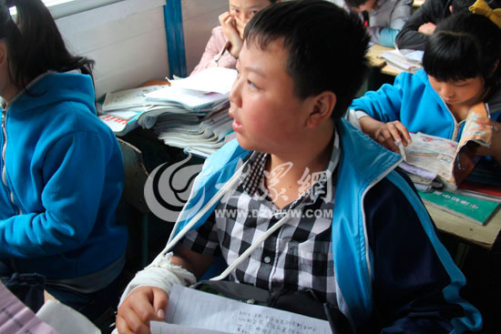 地震時,蘆山縣國張中學9年級4班李耀瓚被玻璃砸傷,4月24日學校復課,他帶傷上課。大眾網特派記者 李兆輝攝