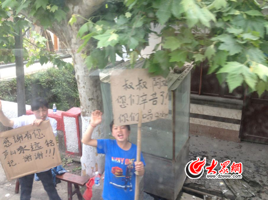 蘆山縣震區(qū)娃娃舉標(biāo)語(yǔ)牌、致敬禮,表達(dá)對(duì)援建者的感謝。大眾網(wǎng)特派記者 攝