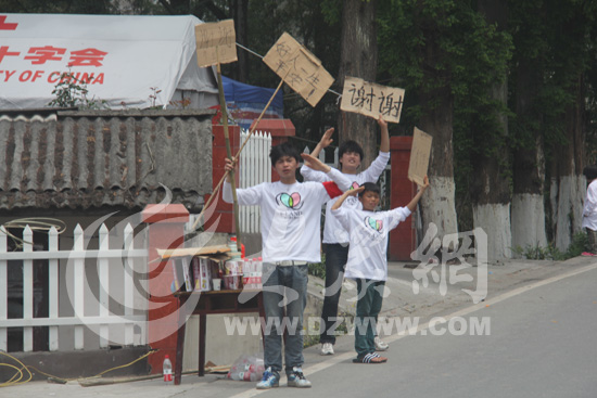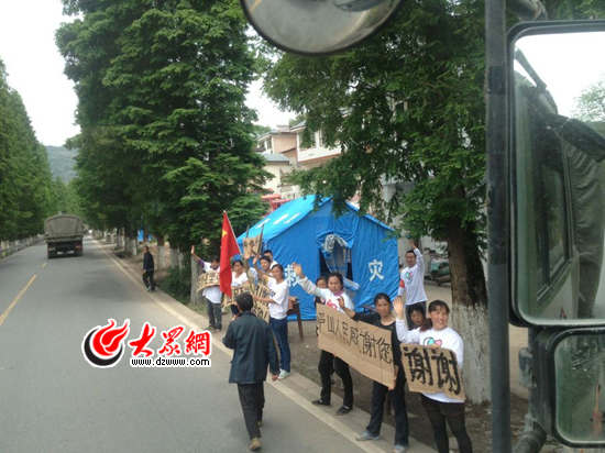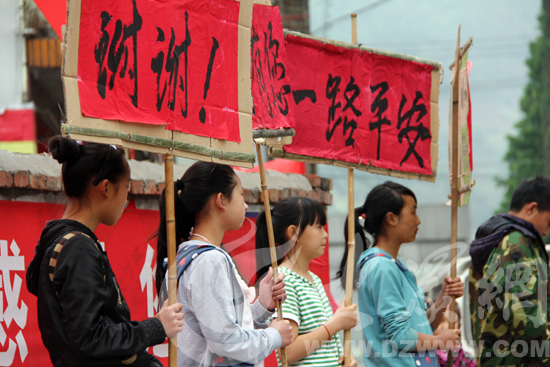 沿途到處是舉著感謝標(biāo)語(yǔ)的災(zāi)區(qū)群眾。大眾網(wǎng)特派記者 攝