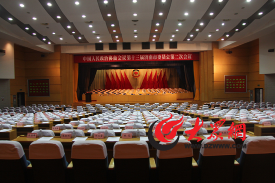 濟南市政協第十三屆二次會議的主會場舜耕會堂以準備就緒,現場沒有擺設鮮花、鋪設紅毯。