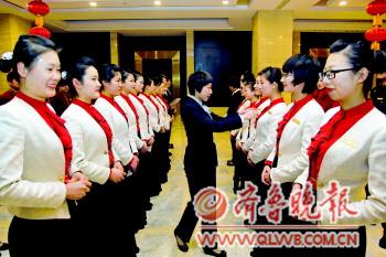 ▲宴會(huì)廳服務(wù)人員進(jìn)行餐前培訓(xùn)。本報(bào)記者王鑫攝
