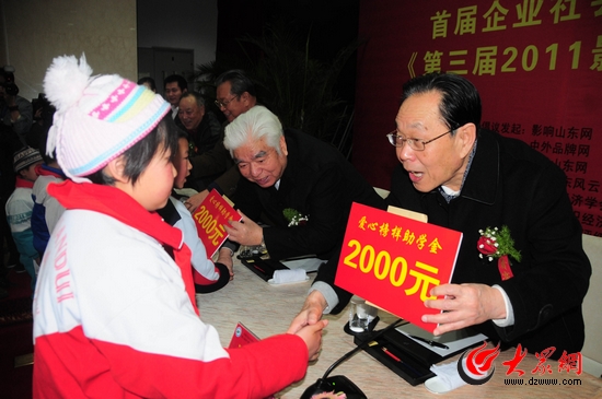 大眾網濟南3月3日訊(記者 徐明) 由影響山東網、中外品牌網、山東省經濟學會、山東省信譽評級委員會辦公室等多家單位聯合倡議發起舉辦的首屆企業社會責任與愛心榜樣公益活動暨《第三屆2011影響山東風云人物》大型圖書首發式3日在濟南山東大廈隆重舉辦。省里老同志陸懋曾、譚福德、董鳳基等出席會議并為來自臨沂、聊城兩市的貧困學生代表發放了助學金及學習用品。