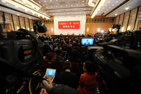 3月2日,全國(guó)政協(xié)十二屆一次會(huì)議新聞發(fā)布會(huì)在人民大會(huì)堂一樓新聞發(fā)布廳召開。新華網(wǎng)/中國(guó)政府網(wǎng) 陳競(jìng)超 攝 3月2日,全國(guó)政協(xié)十二屆一次會(huì)議新聞發(fā)布會(huì)在人民大會(huì)堂一樓新聞發(fā)布廳召開。新華網(wǎng)/中國(guó)政府網(wǎng) 陳競(jìng)超 攝