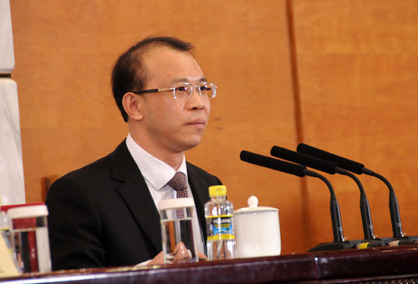 3月2日,全國政協十二屆一次會議新聞發布會在人民大會堂一樓新聞發布廳召開。圖為全國政協辦公廳新聞局局長張敬安。新華網/中國政府網 翟子赫 攝