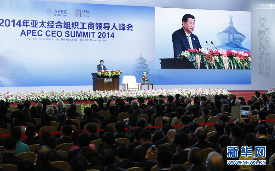 11月9日,2014年亞太經(jīng)合組織工商領(lǐng)導(dǎo)人峰會在北京國家會議中心舉行,國家主席習(xí)近平出席開幕式并發(fā)表題為《謀求持久發(fā)展共筑亞太夢想》的主旨演講。 新華社記者 鞠鵬 攝