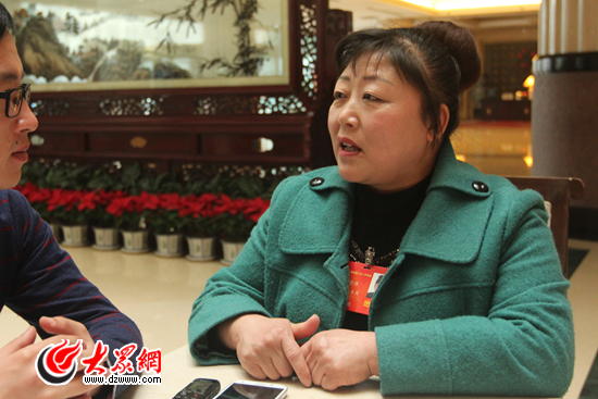 全國人大代表、山東三箭置業有限公司油漆工陳雪萍接受大眾網記者采訪。特派記者 尹海洋 攝